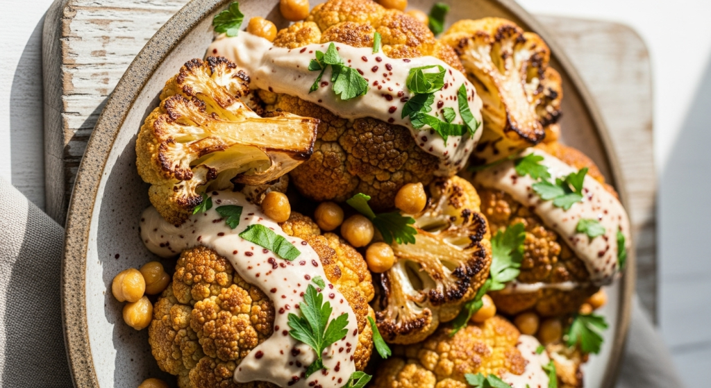 - Once the cauliflower is beautifully roasted, transfer to a serving plate, drizzle generously with the creamy tahini sauce, and garnish with chopped fresh parsley and toasted sesame seeds.