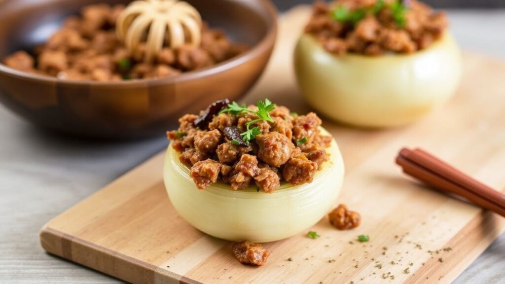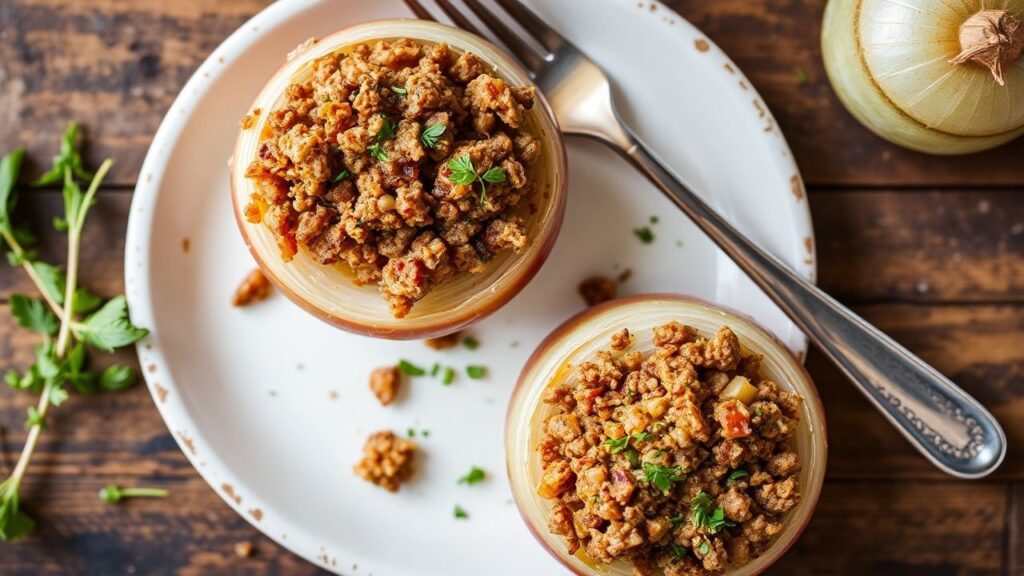 Serve savory stuffed onions hot so the onion layers stay soft and the meat stays juicy. Warm plates help the dish hold temperature.